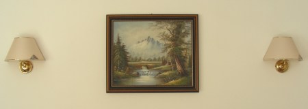 Schlafzimmerbild (Fulpmes) beiderseits wachen die Lampenzwerge dazwischen grüne Ufer mit Bäumen und in der Mitte unter dem Berge das Loch durch das die Wildwasser schäumen