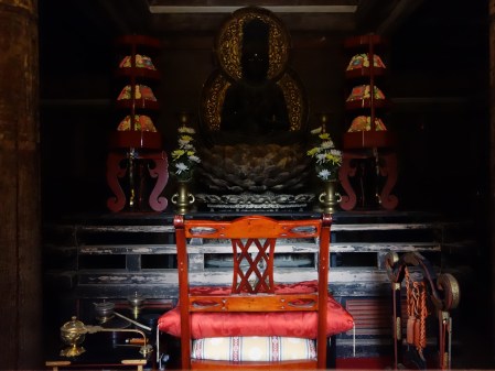 in der Pagode vor einem schwarzen Buddha ein knallroter Stuhl