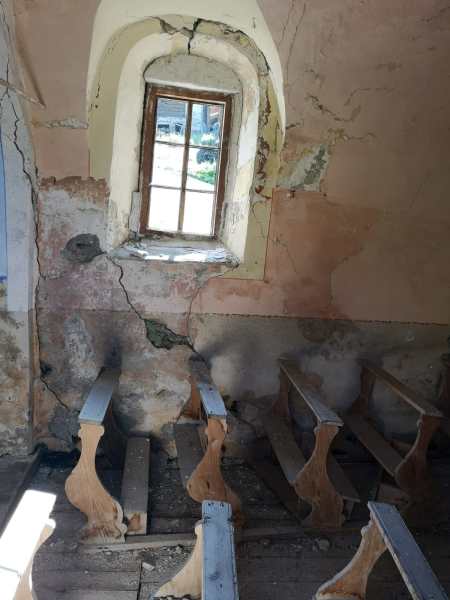 Verlassene Kapelle mit frommem Knarzen schreiten die leeren Bänke nach vorn zum Altar Foto: J. Ortner