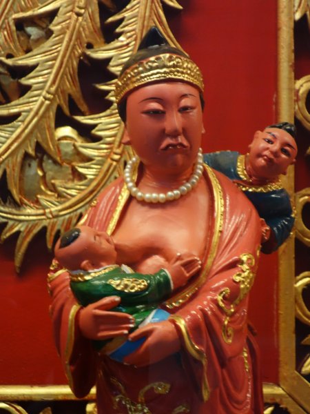 „Lady Linshui is a deity born from the legend of a woman named Chen Jinggu. This was a woman of the early AD700’s who was said to be the daughter (or avatar) of the goddess Guanyin. Chen Jinggu was a prodigy child who could speak shortly after birth and write shortly after learning to walk. She had a very storied life, but to make a long story short, she was a rain shaman who battled snake demons and then became a master of childbearing practices after her death. Legends abound about her life and she is well represented in popular film and fiction.“ (Quelle: https://tainancity.wordpress.com/2010/11/06/lady-linshui-temple/)